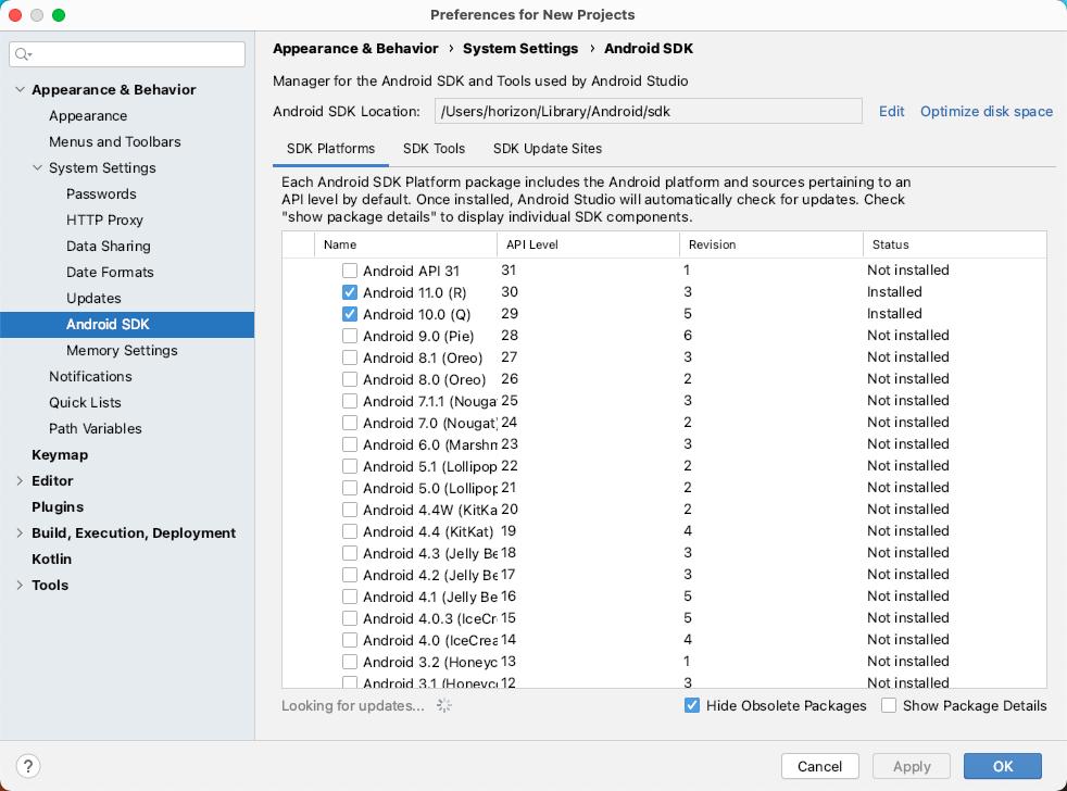 After downloading and installing Android Studio, there are three places that need to be installed- SDK Manager, install SDK Platforms, add the required Android versions based on actual needs